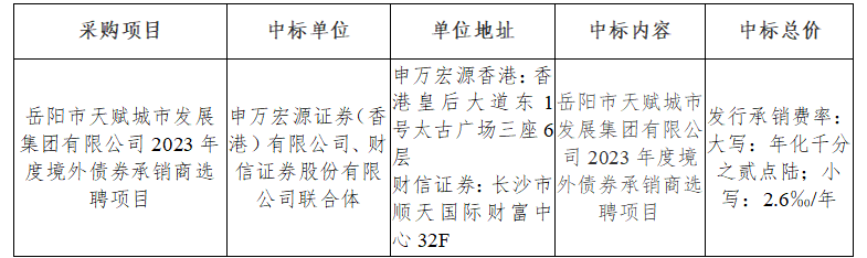 我公司就岳陽市天賦城市發(fā)展集團(tuán)有限公司2023年度境外債券承銷商選聘項目采用邀請招標(biāo)方式確定服務(wù)的主承銷商,評標(biāo)工作已完成,現(xiàn)就本次采購的成交結(jié)果公告如下: