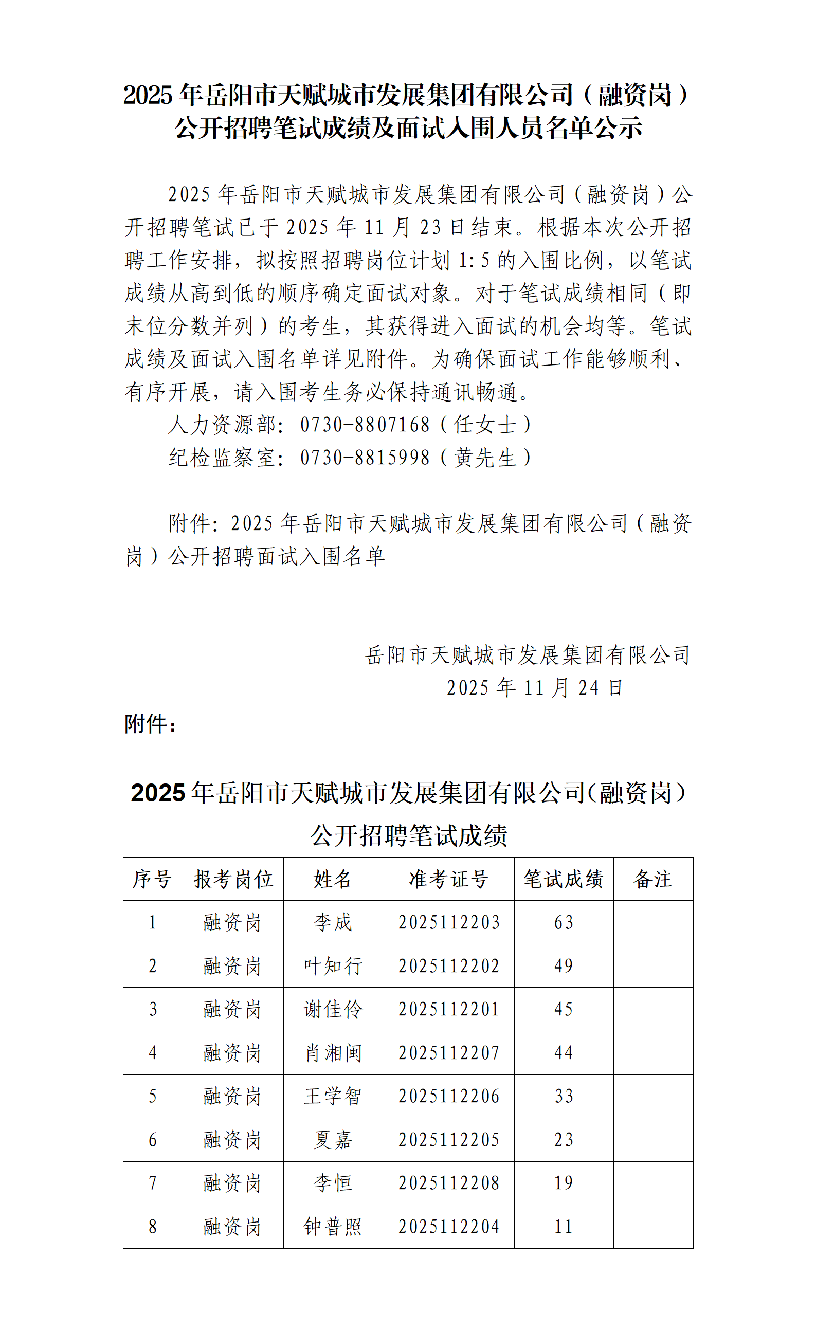 2025年岳陽市天賦城市發(fā)展集團有限公司(融資崗)公開招聘筆試成績及面試入圍人員名單公示
