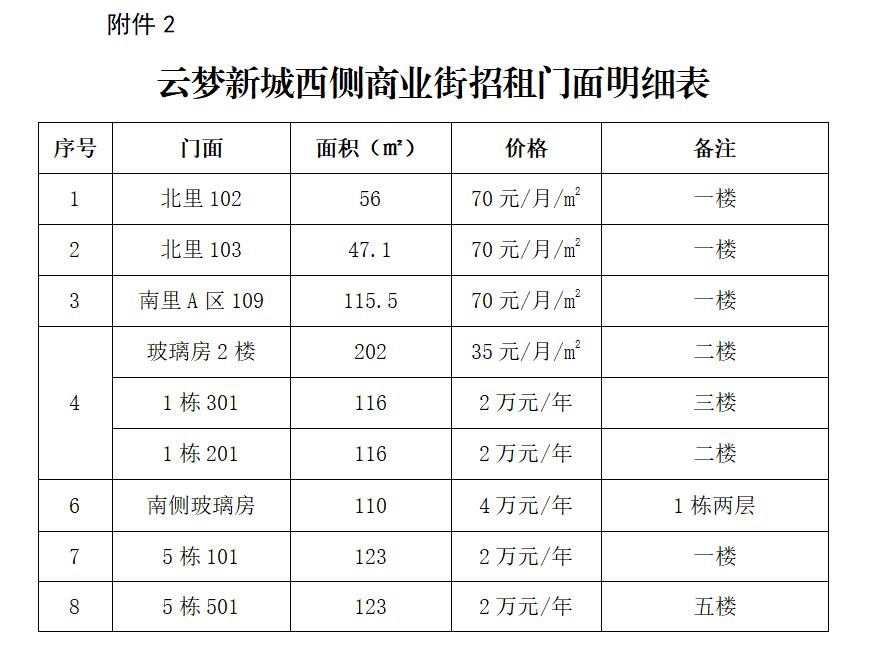 標(biāo)的3:云夢(mèng)新城西側(cè)商業(yè)街及配套房位于南湖新區(qū)云夢(mèng)路,千畝湖對(duì)面,共5間商鋪和4套配套房可供出租(詳見(jiàn)附件表格),總面積1008.6平方米,價(jià)格為一樓70元/㎡/月,二樓35元/㎡/月。